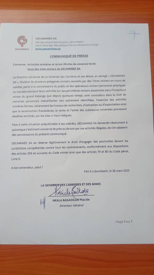 Face à cette situation préjudiciable à ses intérêts, GECAMINES SA demande résolument à quiconque s’estimant concerné de près ou de loin par ces activités illégales, de s’en abstenir dès connaissance du présent communiqué.
